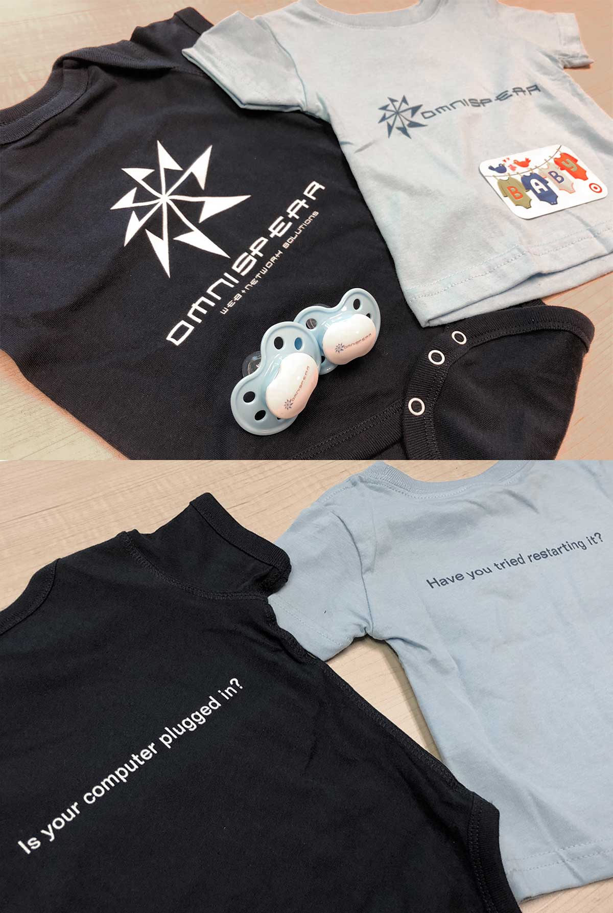 We added something special to this onesie and t-shirt combo since the father is one of our support techs. There’s nothing wrong with teaching them early!